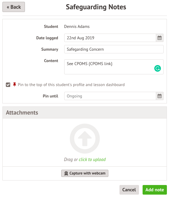 Add a Safeguarding Note and pin it to the top of a student’s Student Profile and the Lesson Dashboard from the Safeguarding Notes section.
