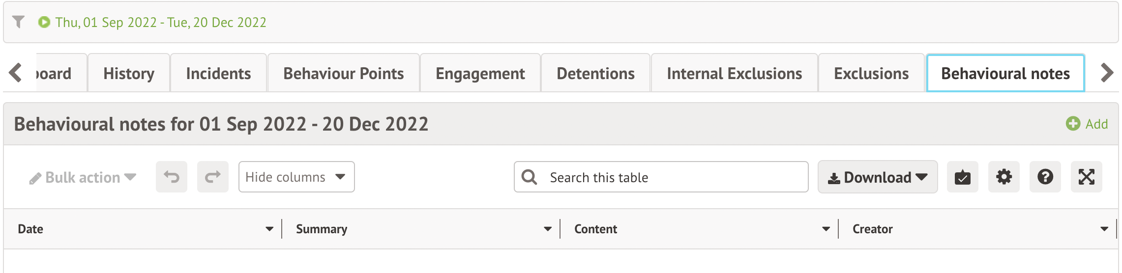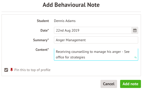 The Behaviour > Behavioural Notes tab section allows you to record a note and pin this to the student profile.