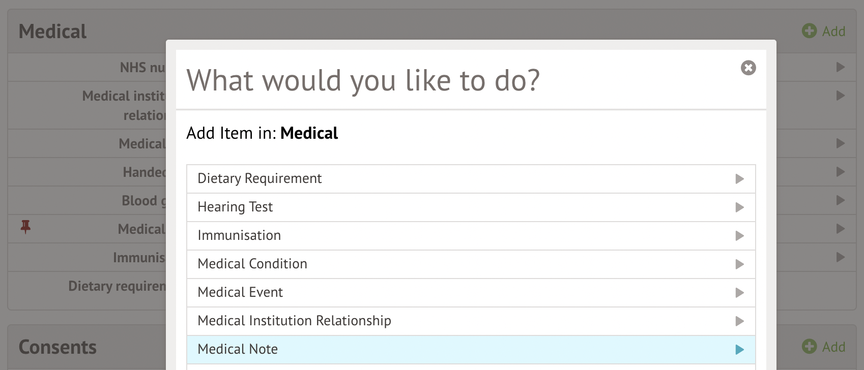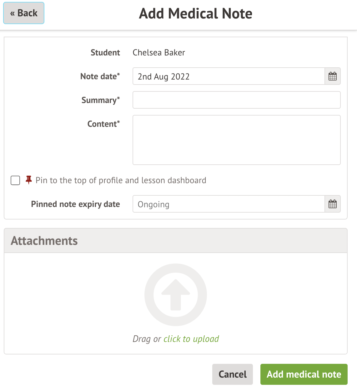 The Medical section allows you to record a medical note and pin this to the student profile.