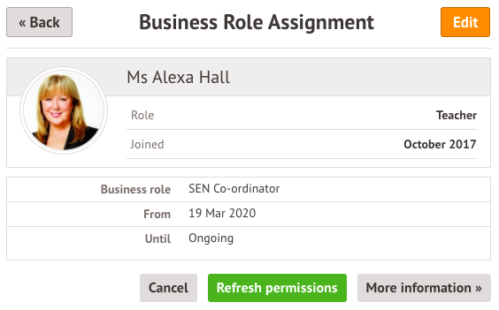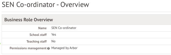 If you click on the More Information button, you will be taken to the coordinator's Business Role Overview where you can view the full details of his/her role and also update the role permissions. The role permissions for SEN/ALN Co-ordinator are managed by Arbor by default.