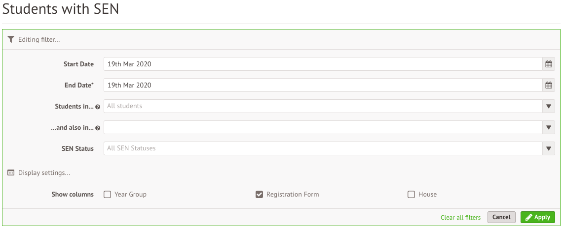 If you click on the filters at the top of the page you can narrow down your search by their start and end dates, by Reg. forms, year groups and houses, and also by their SEN/ALN status.