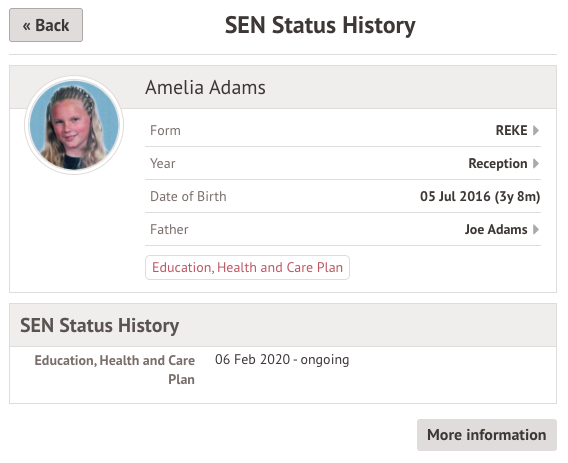 If you click on the More Information button you will be taken to that particular student's profile on the Educational Needs section where you will be able to find all the required information.