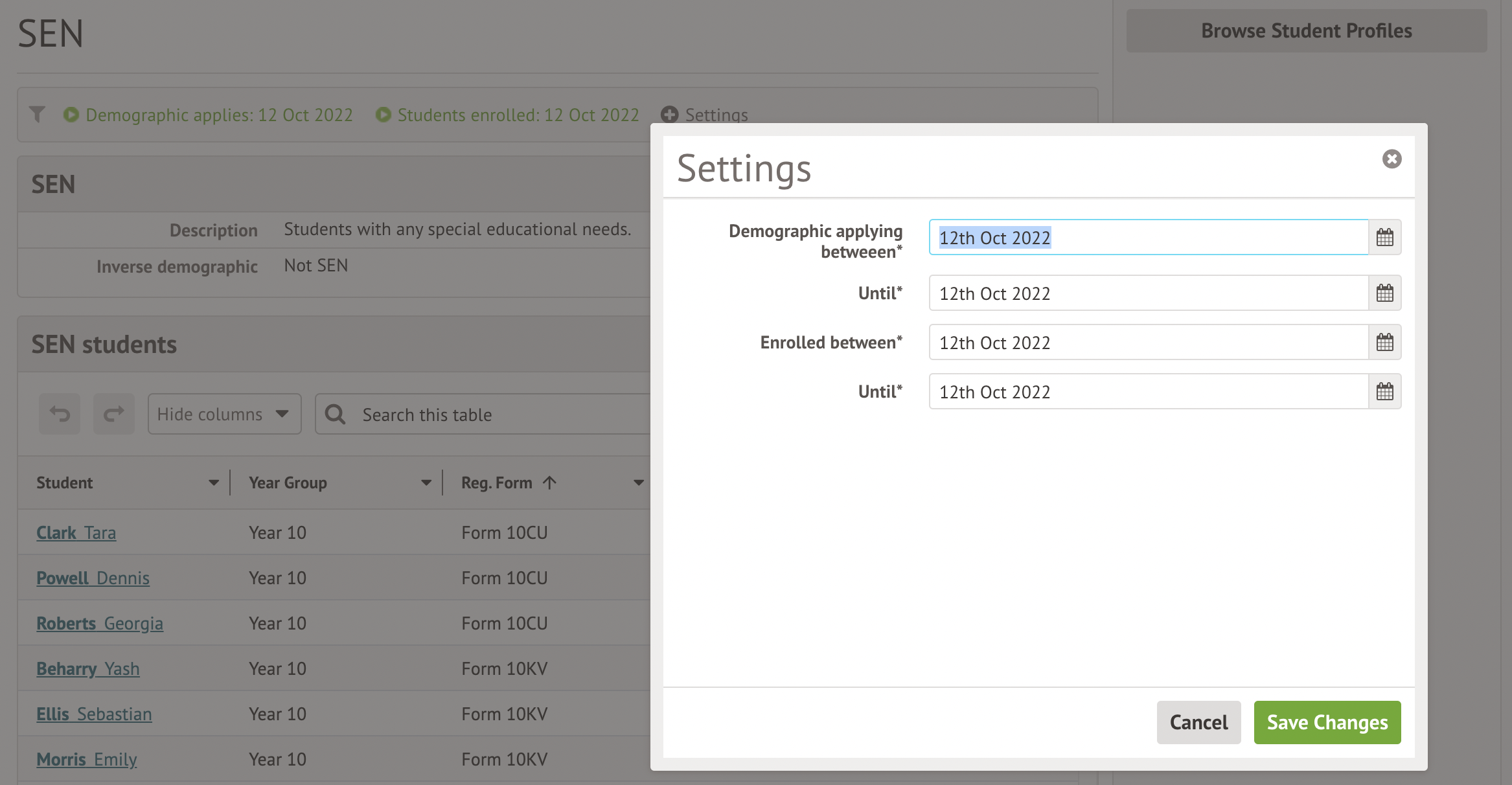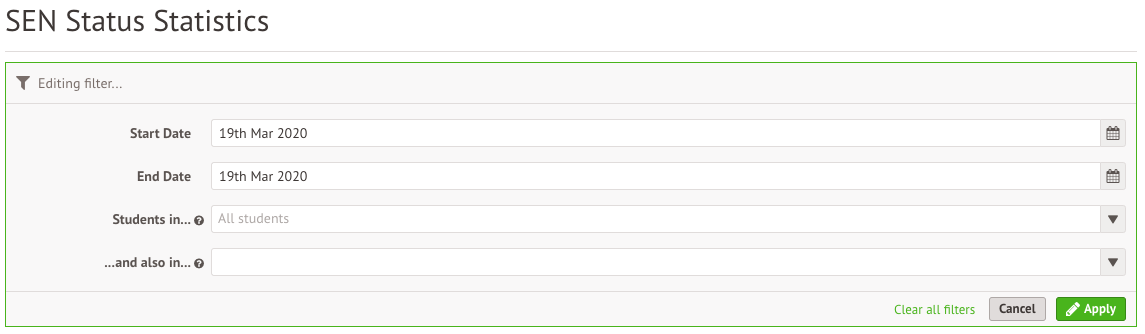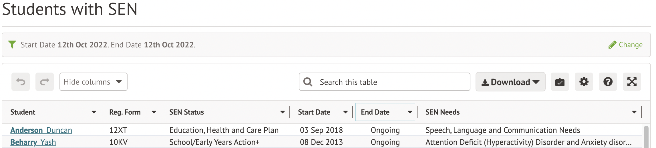 You can also view an alternate version of the SEN/ALN table in Students > Demographics > Derived Indicators > Educational needs > SEN/ALN. In this view you can use the filters to see students enrolled on certain dates.