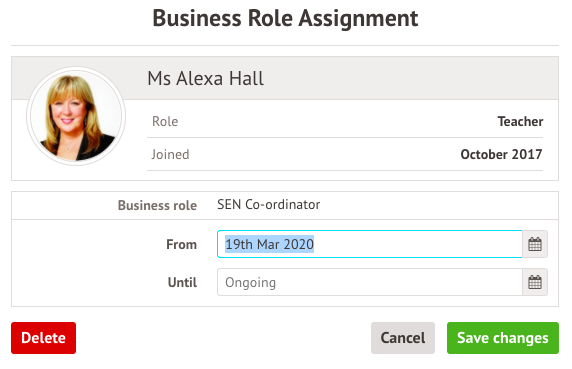 Clicking Edit allows you to update the coordinator's business role dates and also delete the role if need be (as shown below).