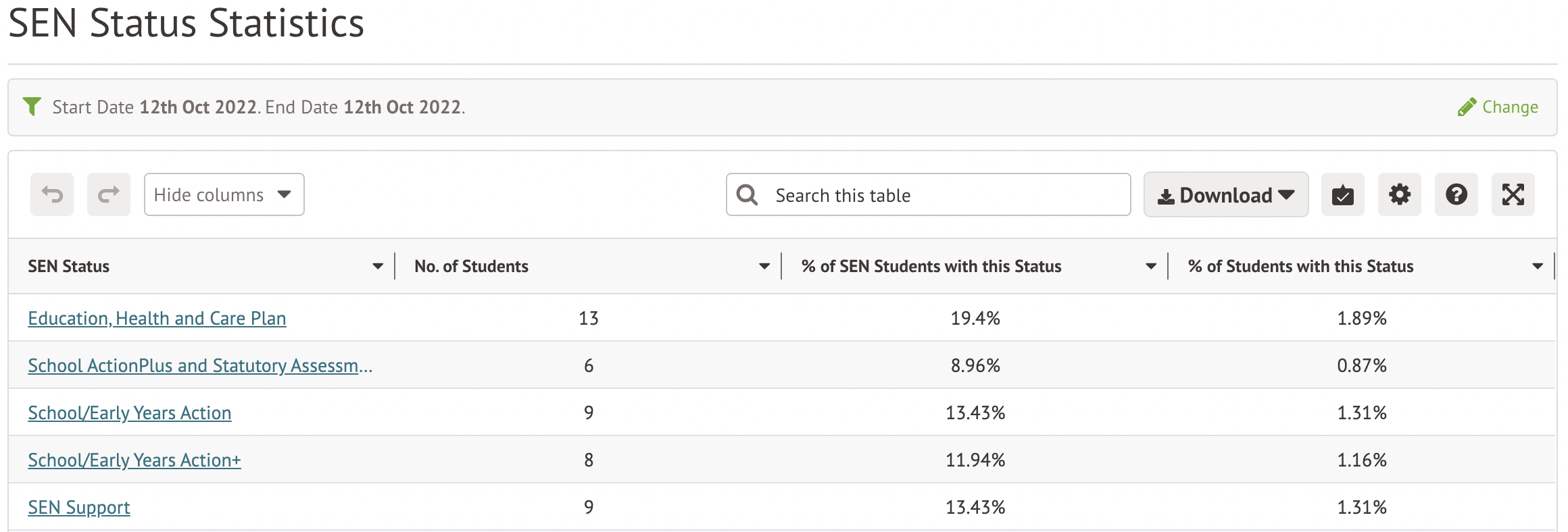 The end column is referring to the percentage of students based on the students you have selected the show in the filter. This is automatically set as All Students so this figure is the % of students with SEN/ALN out of your whole school. Top Tip: Your percentages won't add up to 100%, because a student with multiple needs will fall into the figures for more than one row.