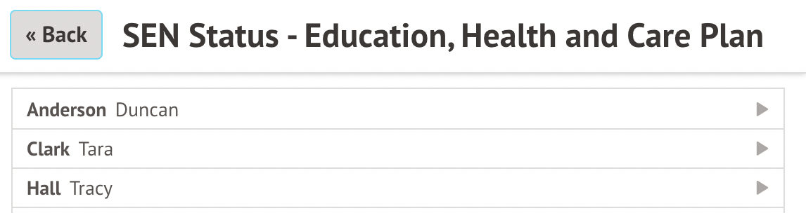 If you click on a particular SEN/ALN Status on the SEN/ALN Status page, such as Education, Health and Care Plan (as shown in the below screenshot), you will be given a list of the students who fall under that category.