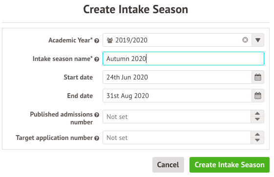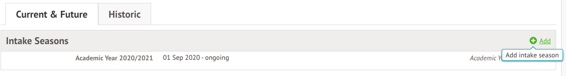 To enable you to add new applicants for the next year you need to first create an intake season. This area of Arbor is separate to the New School Year setup area, as you'll need to set up a new intake season for each new cohort of students that apply to your school, such as nursery pupils starting in Spring term.
