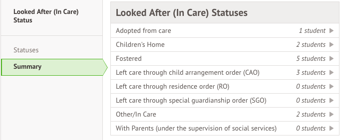 - The Summary section will allow you to see a list of the Looked After (In Care) students, categorised according to their Looked After (In Care) statuses