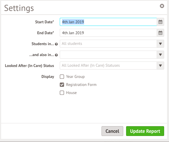 If you click on the Green filters you can narrow down your search accordingly (as shown on the screenshot below). You can filter the students by their start and end dates, by reg. forms, year groups and houses, and also by their In Care status.