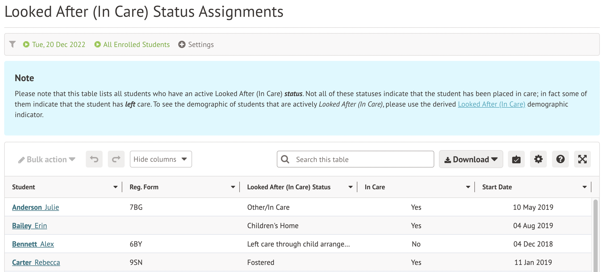 This table lists all students who have an active Looked After (In Care) status. Any students who are Looked After will have 'Yes' in the In Care column, whereas students who are Post Looked After will have 'No'.