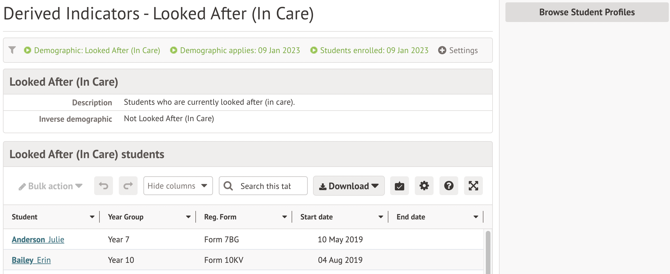 You can see a list of students, including their name, year groups, registration form and the dates they start and stop being this demographic.