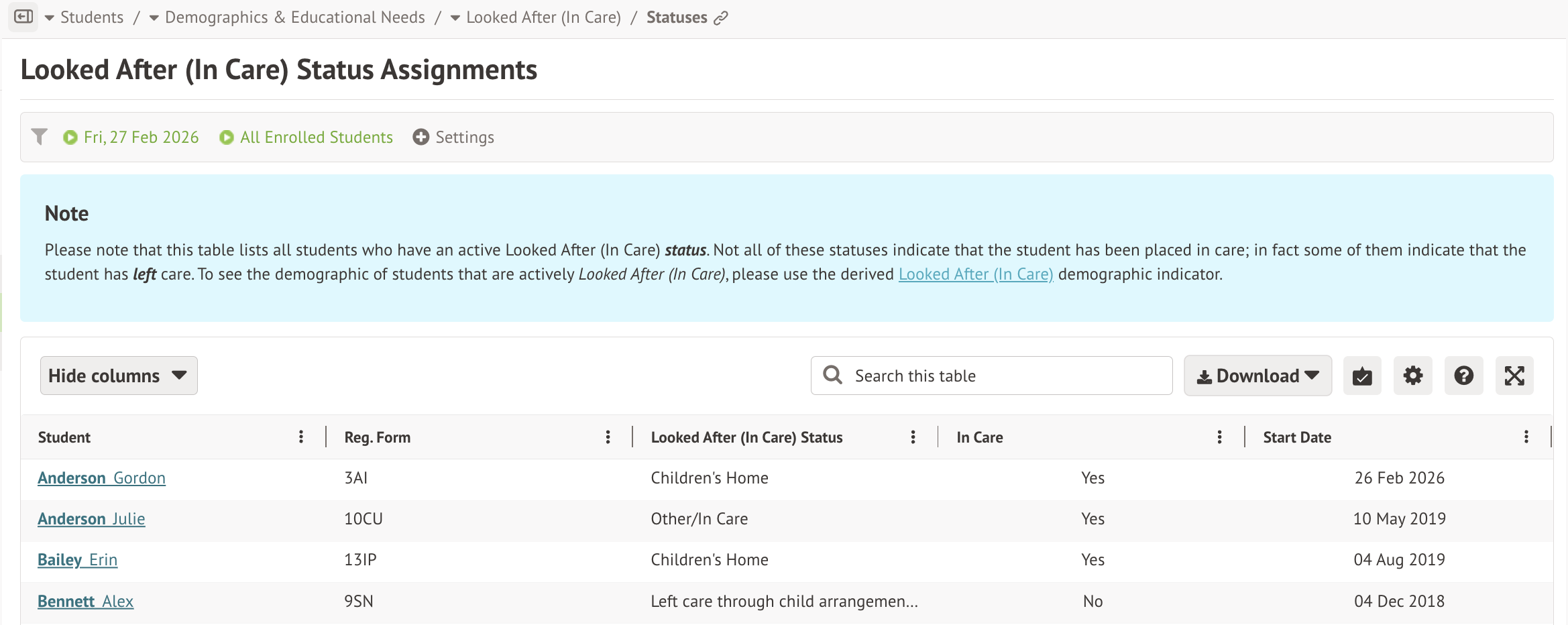 This table lists all students who have an active Looked After (In Care) status, including Post Looked After.