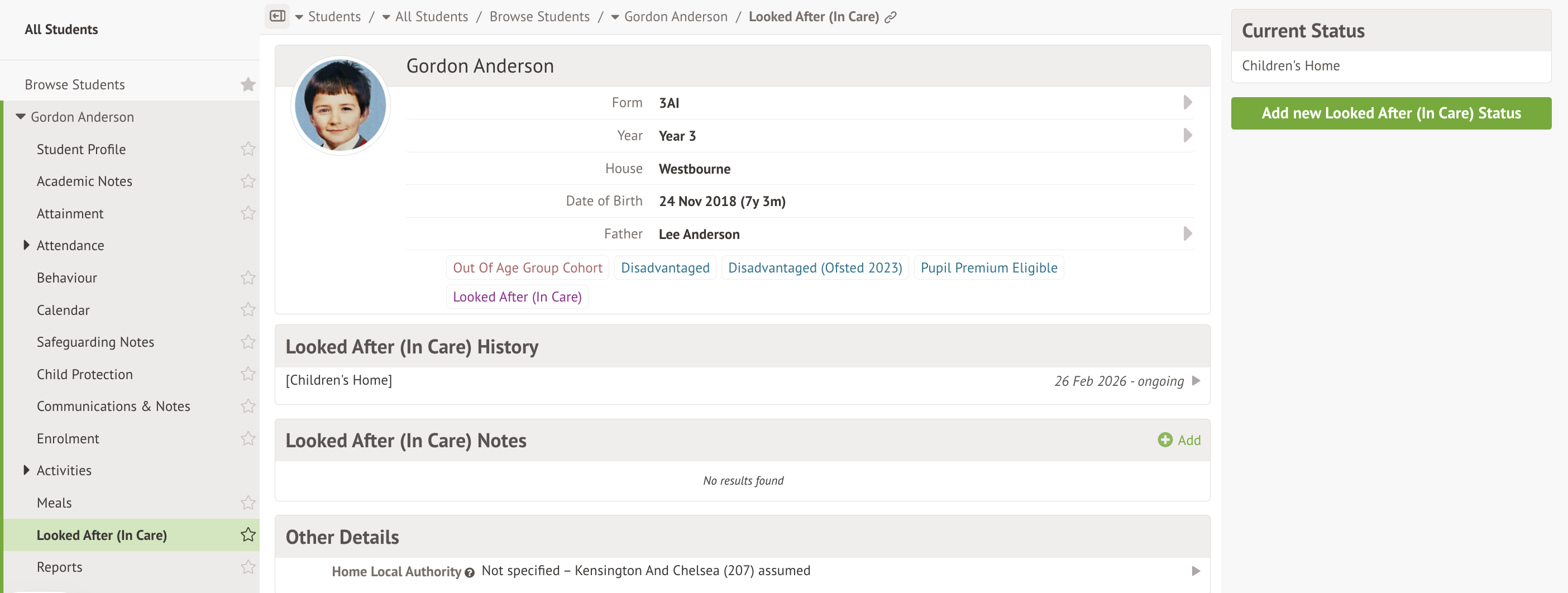 If you click on a student's name, you will be taken to that particular student's profile, onto the Looked After (In Care) section.