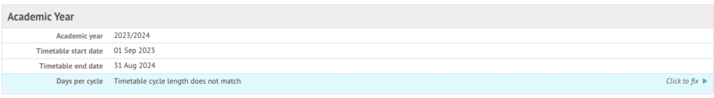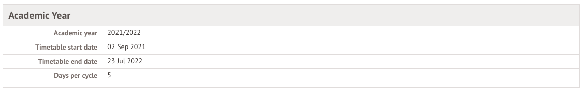 - the Days per cycle field displays the number of days after which the timetable is repeated (excluding weekends). For example, if your timetable repeated every two weeks, this field would instead display '10'.