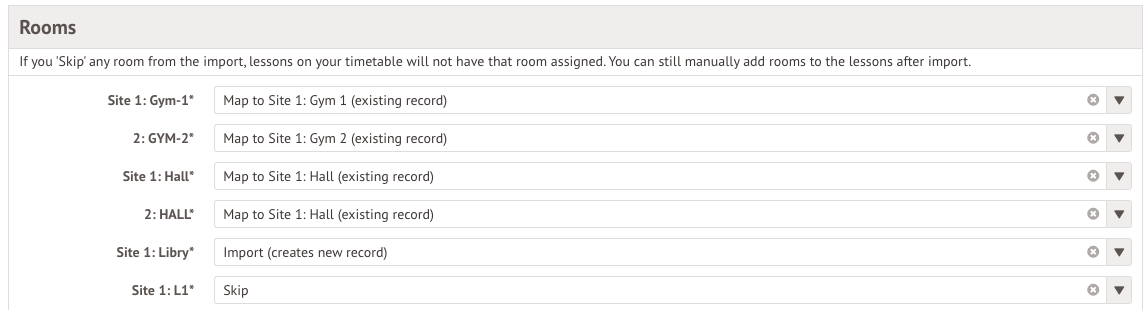 - Skip - The lessons on your timetable will not have those rooms assigned, and you will need to assign rooms manually after the import process is complete.