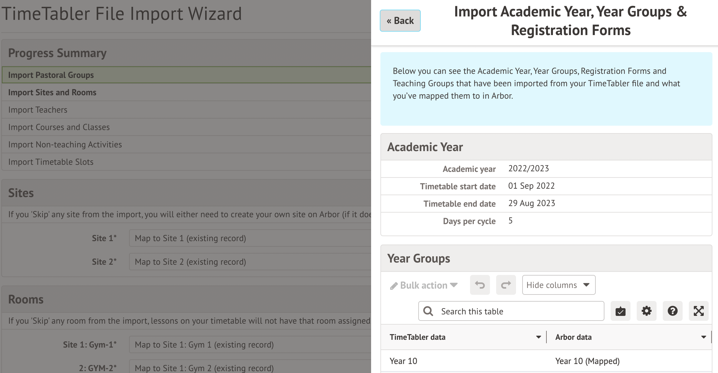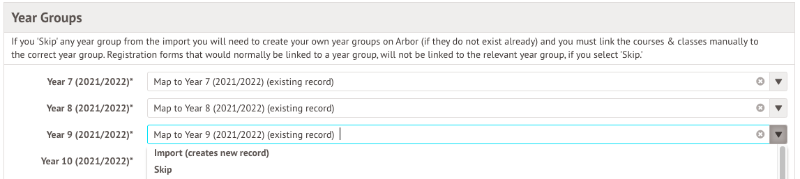 Step One is to import the academic year and map the year groups and registration forms to your existing ones. The names on the left-hand side refer to the groups set up in TimeTabler. The groups that appear in the drop-down menus refer to the groups you have already set up in Arbor.