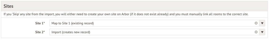 - Import - Where the site/room does not currently exist in Arbor, you can create a new one by selecting Import.