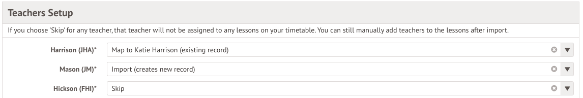 - Skip - Courses in your timetable will not have those staff assigned, and you will need to assign staff manually after the import process is complete.