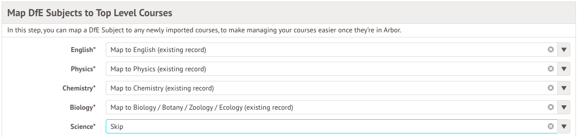 Next, you can map DfE subjects to your top-level courses. Class subjects are required for the Spring School census so we recommend adding this information in, but you can choose to either map or skip.