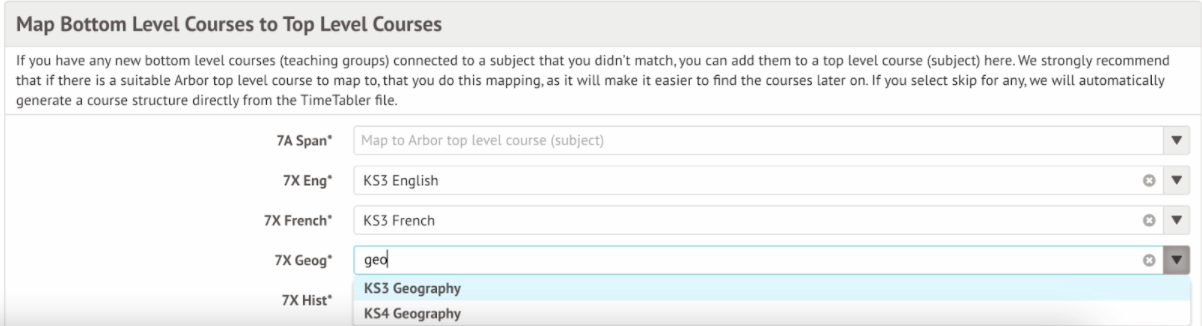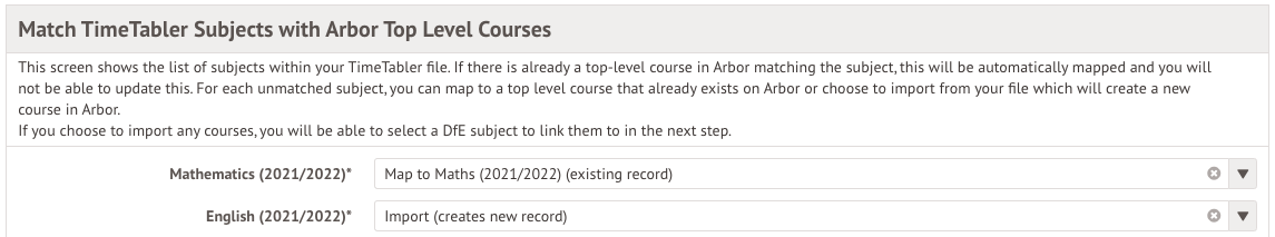 - If you're importing a timetable mid-year, please map as many of your subjects as possible. This will prevent duplicate courses from being created. The list available to map is based on the courses you have set up in Arbor already.