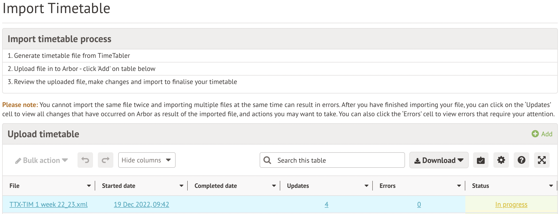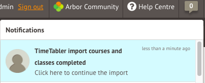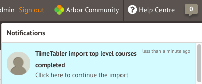 - If it is remaining as In progress for more than 30 minutes, please try importing your file again. Top Tip: You can create a new export file in TimeTabler with the same name and this can then be imported into Arbor.