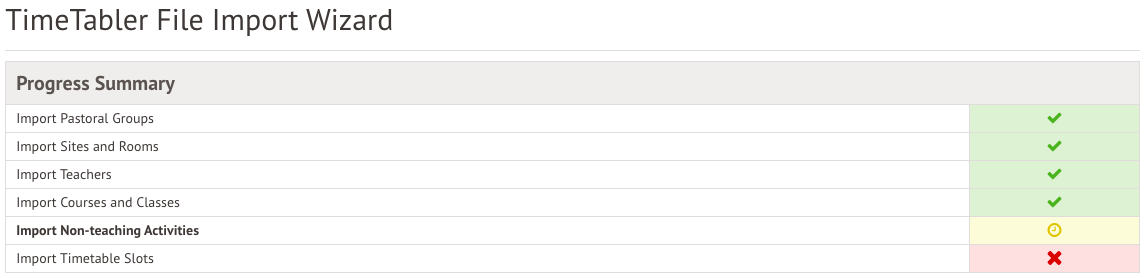 After you have uploaded your TimeTabler file, you will enter the TimeTabler File Import Wizard. Once each stage has been completed and saved, it will show as complete at the top of the screen with a green tick icon.