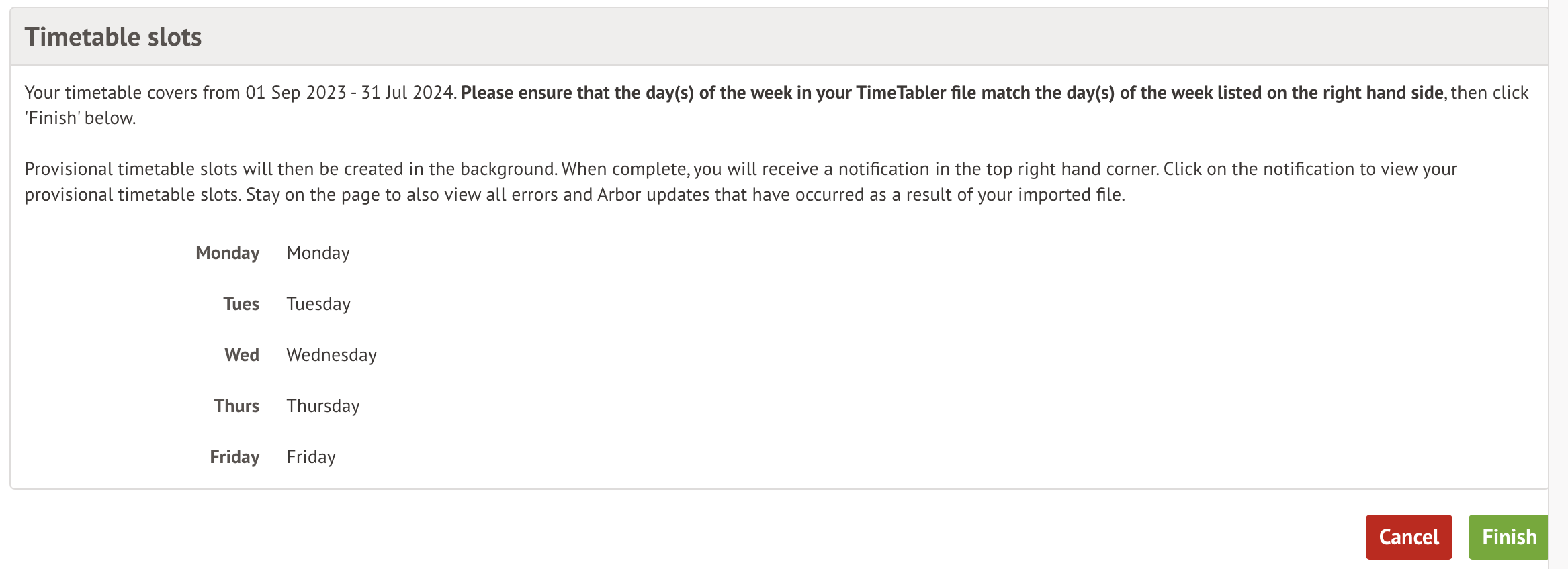 The final step imports timetable slots from the TimeTabler file on Arbor. Double-check that the days of the week have been matched correctly.