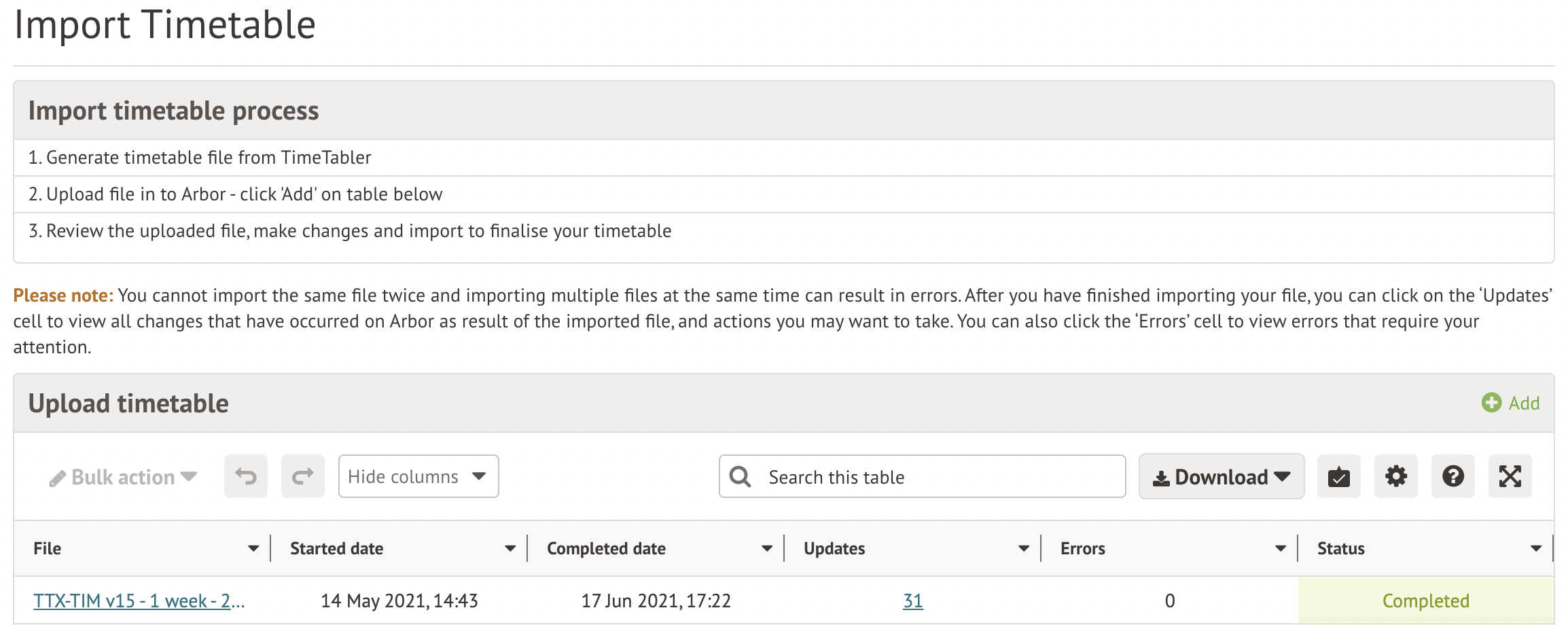 - Mid-year or replacing your import - School > Timetable > TimeTabler Integration > Import Timetable to upload it to Arbor by working through the TimeTabler File Import Wizard.