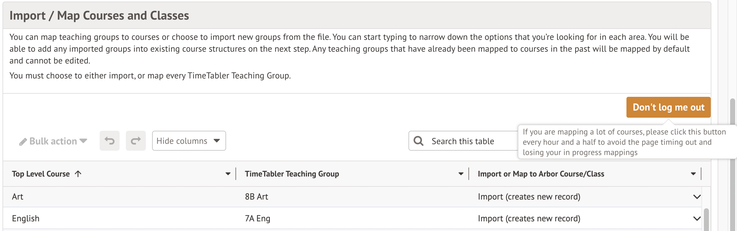 Top Tip: Have a lot of courses to map? Click the Don't log me out button regularly.