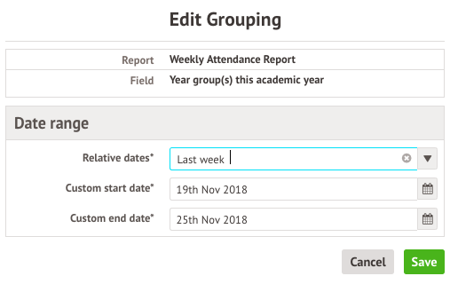 For instance, if your report focuses on students in the Current Academic Year, but you want to group them by last year's year groups, set the date range to Previous academic year.