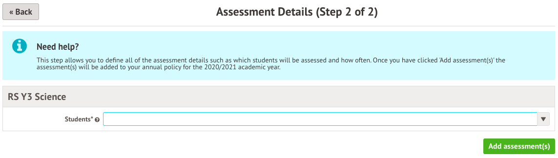 You can then select which students will be assessed by this curriculum assessment this academic year. Click Add assessment(s) to add the assessment to your policy for the academic year.