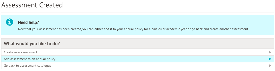 Now you have created your assessment, you need to add it to your Annual Policy to be able to add marks for the current academic year. Click the option to add our curriculum to the Annual Policy, or go to Students > Assessments > Annual Policy and click Add assessment to policy.