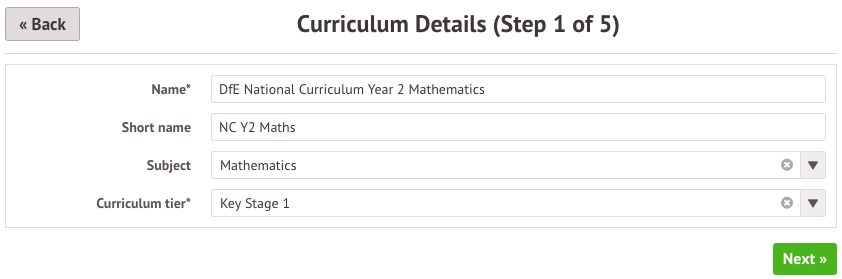 You will be taken to step 1 of the Curriculum setup process. In this step, you can choose what to name your assessment, the subject it links to and what key stage it is applicable to. Click Next once this step is complete.