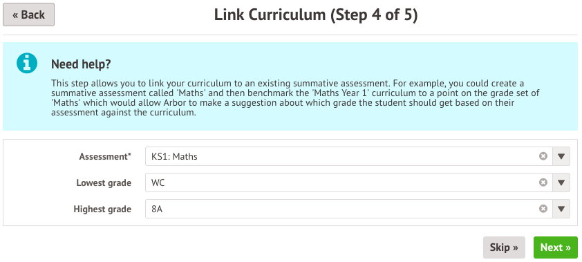 Step 4 allows you to link your curriculum assessment to a summative assessment you have already set up. Just choose the summative assessment from the drop-down list.