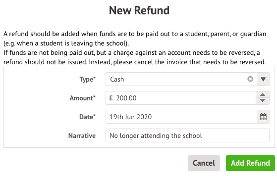Please Note: If money is not being paid out to a Student's parent/guardian, but a charge needs to be reversed, a refund should not be issued. Instead, please cancel the Invoice (for help with this, read this article).