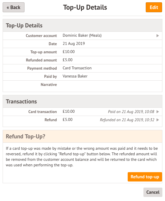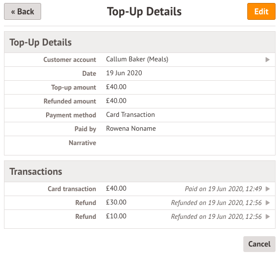 The account balance will then show the refund. If you click into the top-up again you can see further details about the refund, and make further refunds if you didn't refund the whole amount.