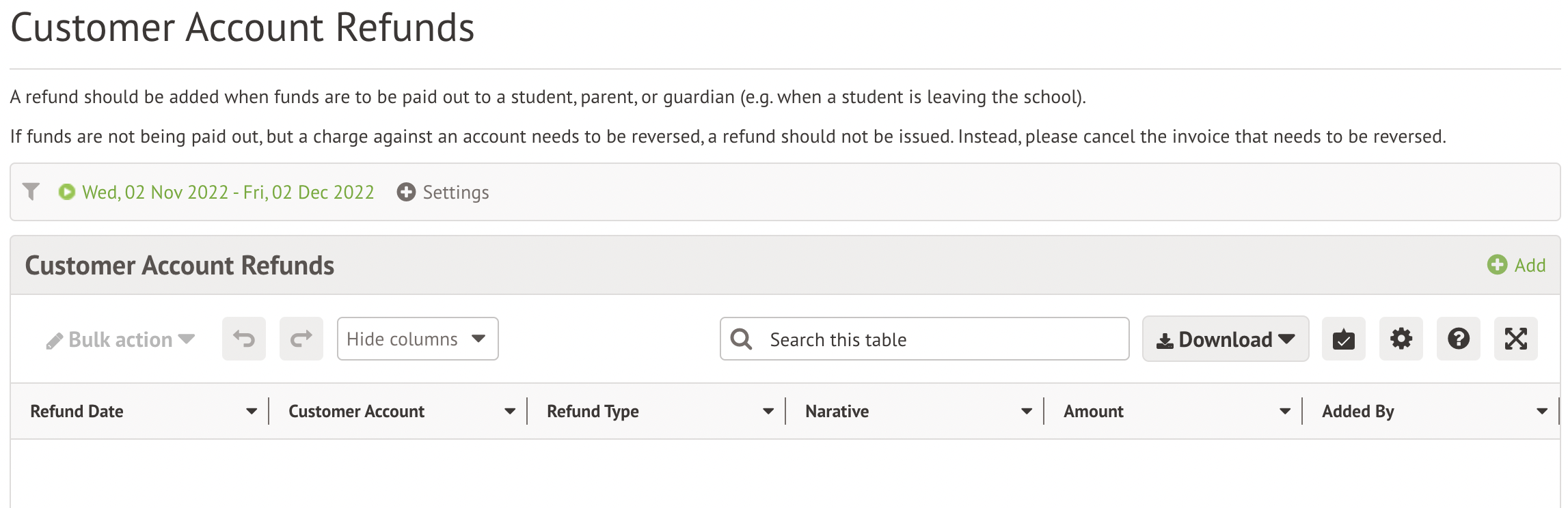 Go to School > Payments > Accounts > Refunds. To issue a new refund, click +Add.