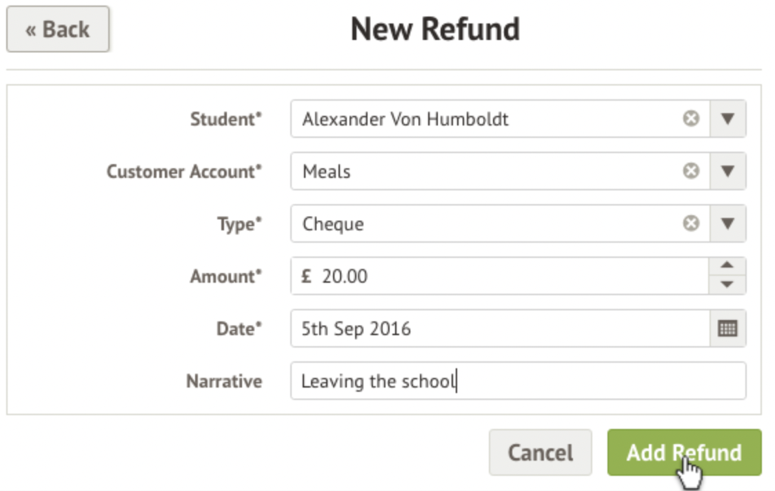 Fill in the details on the slide over, including the Student, Account, and Amount and click 'Add Refund'. The refund will then be recorded, and this will be reflected in the student's Account Balance.