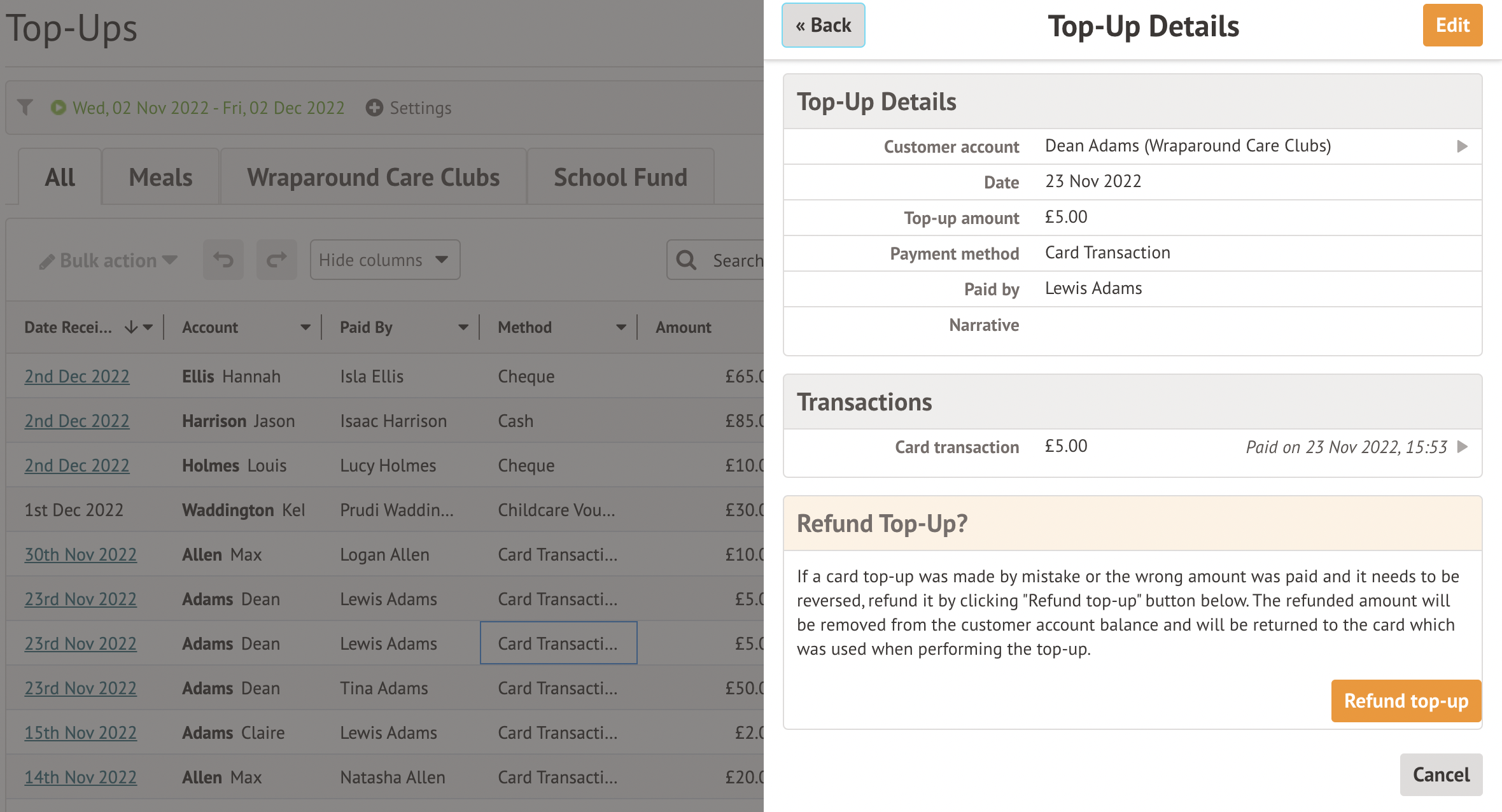 To refund a Meal Top-up fully or partially, go to School > Payments > Accounts > Top Ups and select the card payment you would like to refund.
