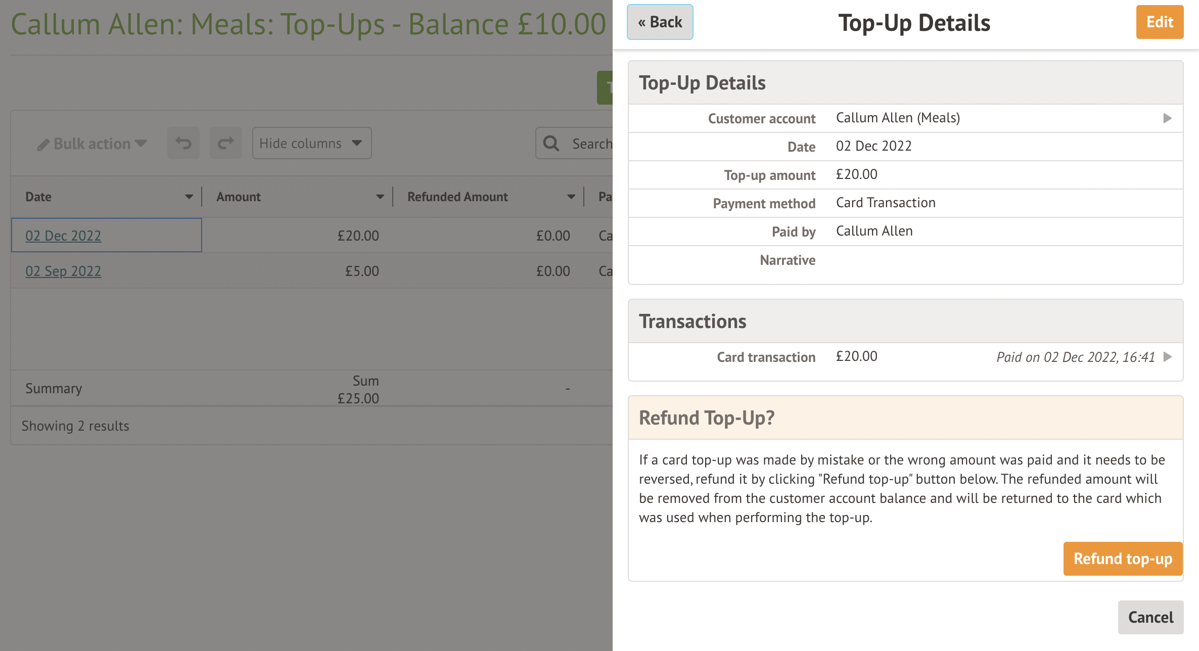 The refund will then be processed. If it is successful, clicking on the payment again from the Top Ups page will show the refund date.