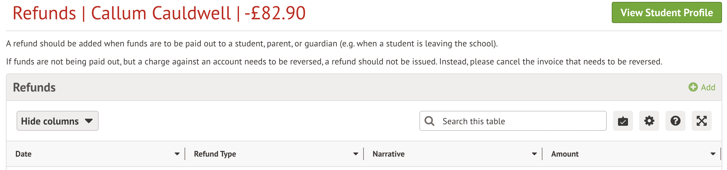 Please note: This process only logs the refund in the system. It is up to your school to actually carry out the physical refund.