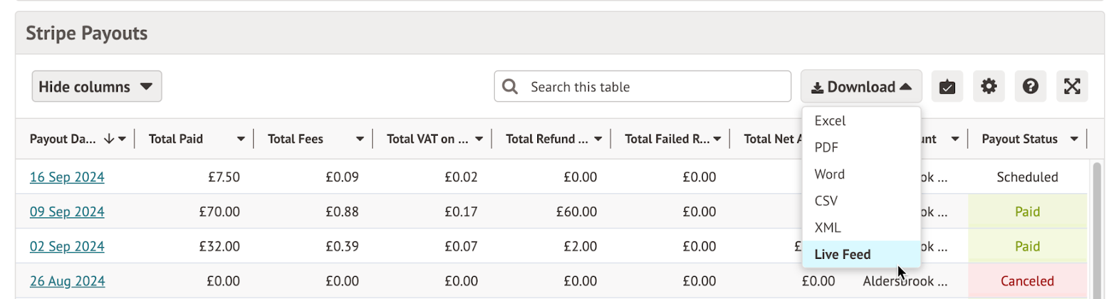 - Go to School > Payments > Reconciliation > Card Payments > Stripe Payouts.