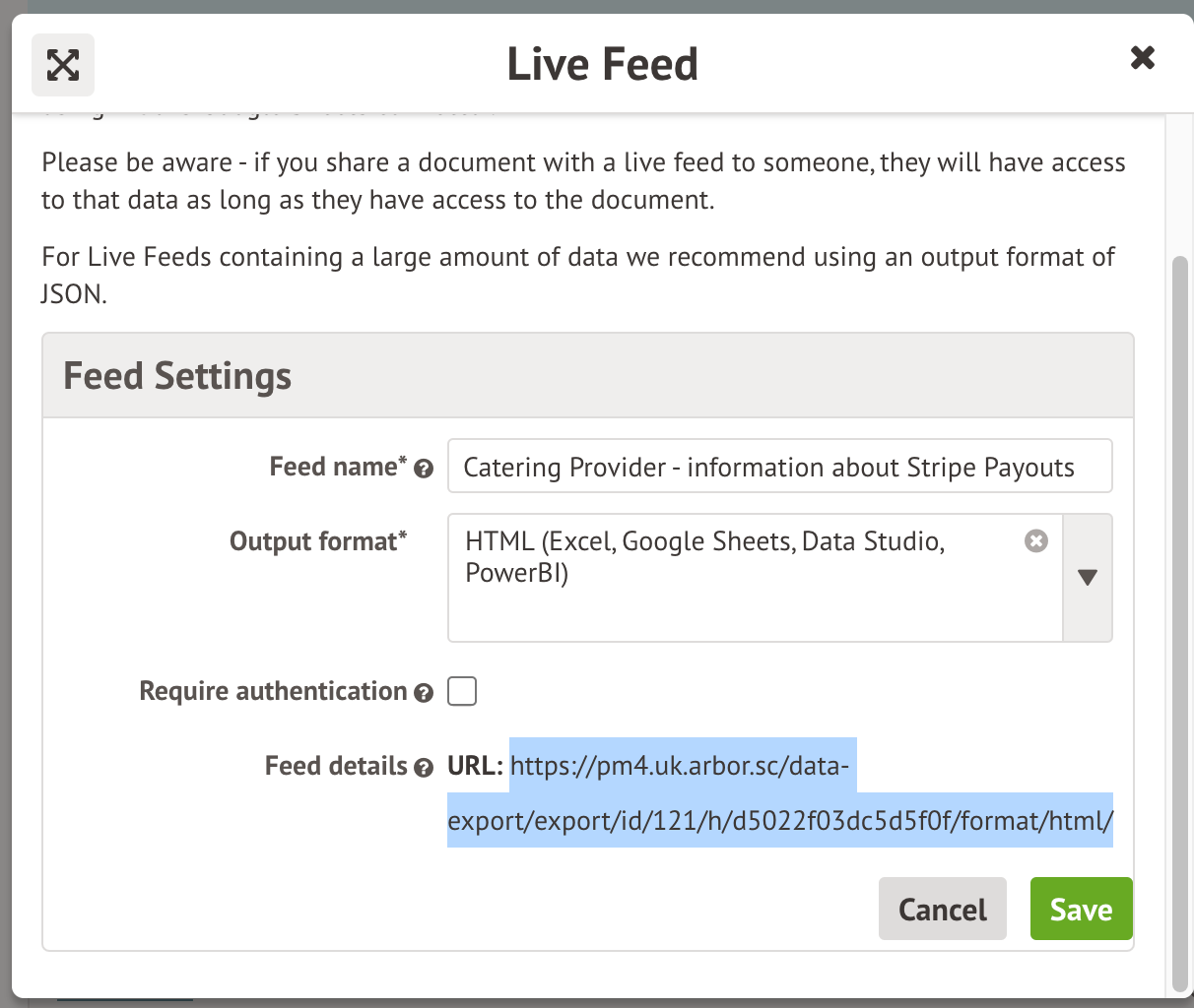 - Highlight and copy the feed details URL and paste it into a secure document to send to your catering provider.