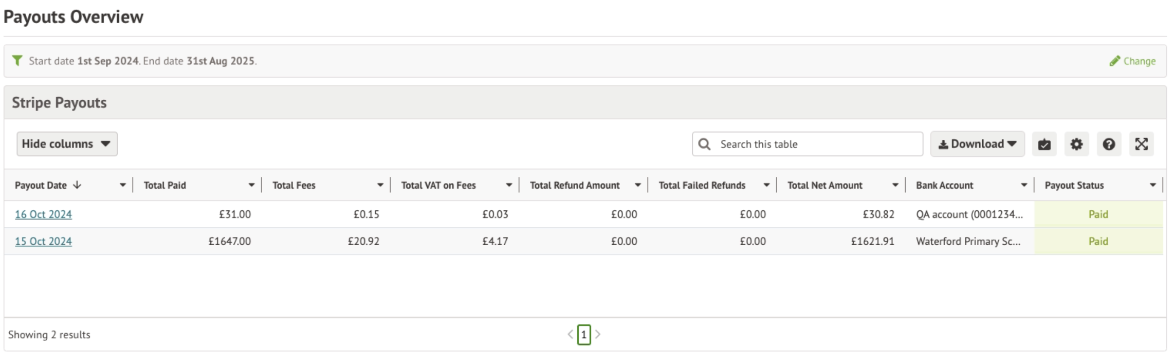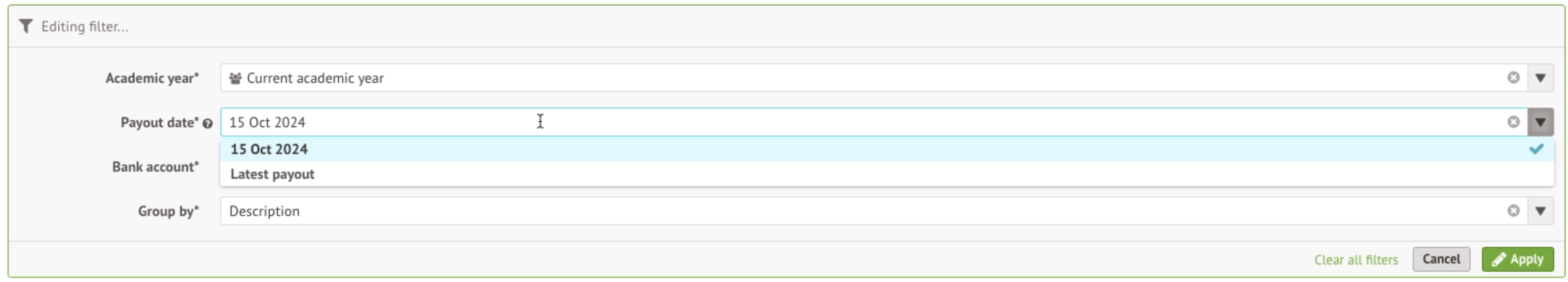 You can change the filters at the top of the page to select the latest payout to see the latest payout that was made to your bank account, and which bank account to display search results for.