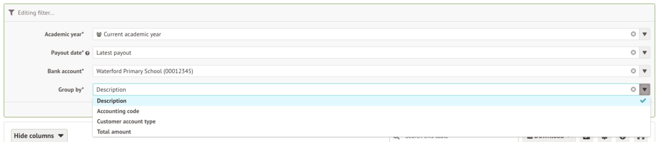 The Settlement Summary report allows users to break down the total payout amount into different payout dates, bank accounts, and groupings. You can find the Settlement Summary in School > Payments > Reconciliation > Card Payments > Settlement Summary.