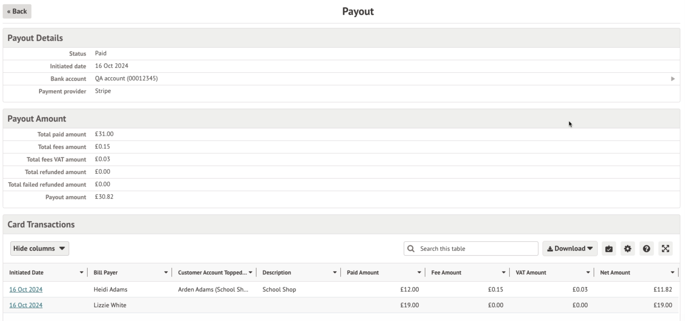 You can also click into the payout and view additional details about the payout including all card transactions, refunds, and failed refund transactions.