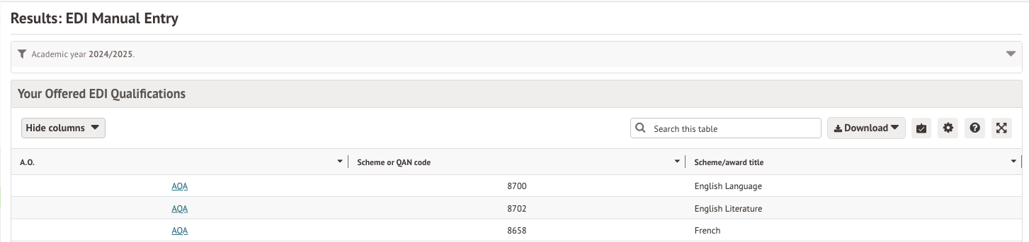 The EDI Manual Entry page lists your EDI qualifications, letting you click into the relevant qualifications, and then select the Learning Units to input marks for.