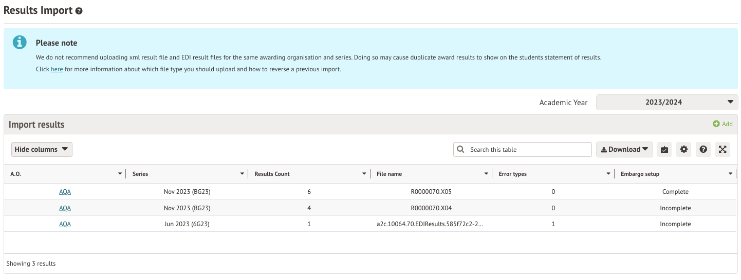 This page is where you can import your results file from the exam board. You can also see a history of past imports from the current or previous academic years.