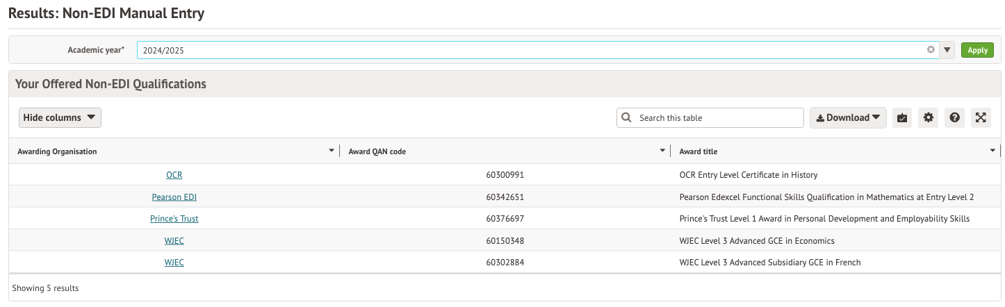The non-EDI Manual Entry page is identical to the EDI Manual Entry page and allows you to input the marks for your non-EDI qualifications. Click the relevant qualification in the list, and then input your marks in the Learning Units.