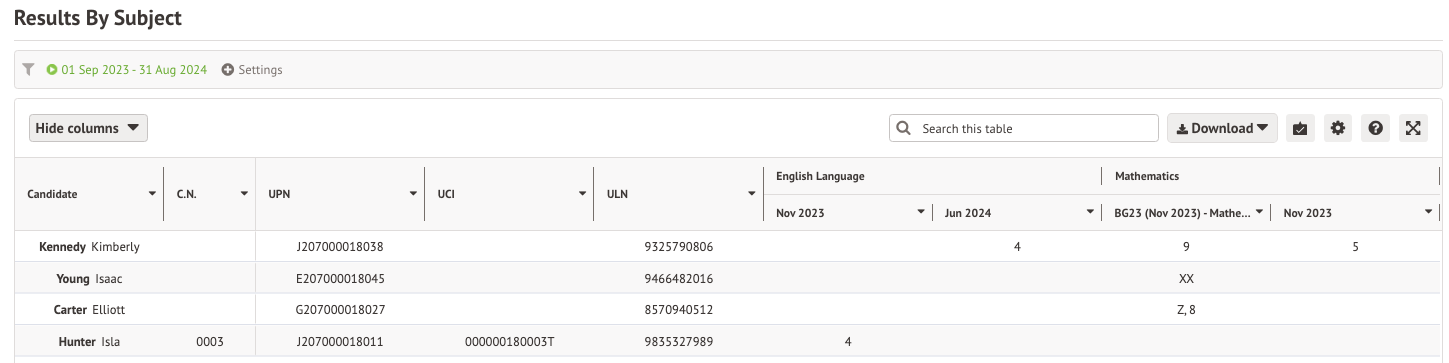 The By Subject page shows you a breakdown of a student's results by subject. You can amend the filter at the top of the page to amend the search dates, groups of students included in the report, and what student information is shown e.g. student ID, name, year group, etc.